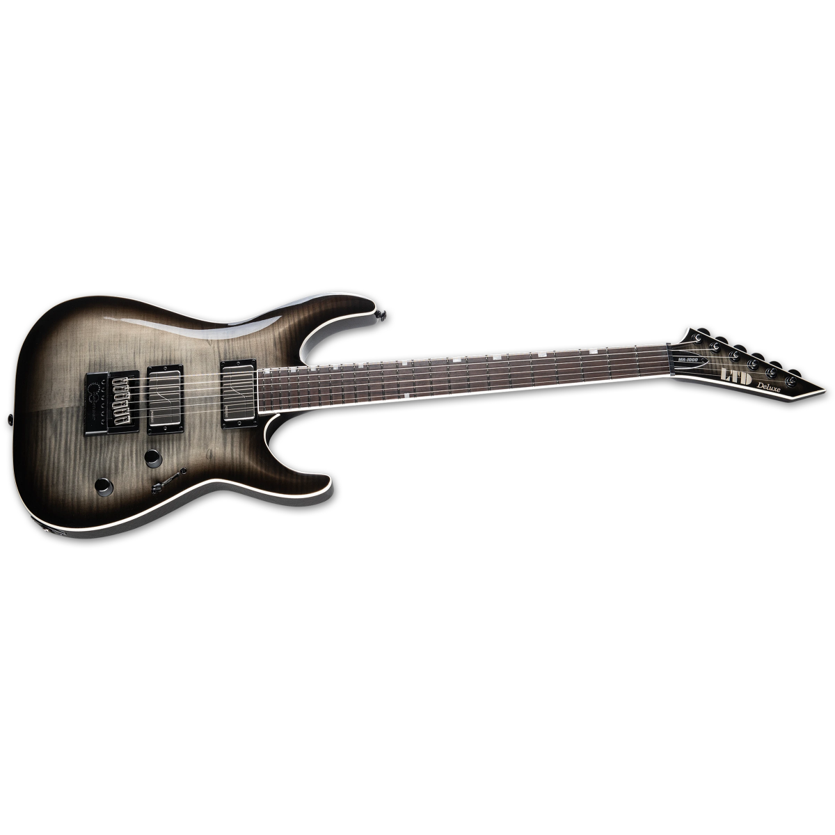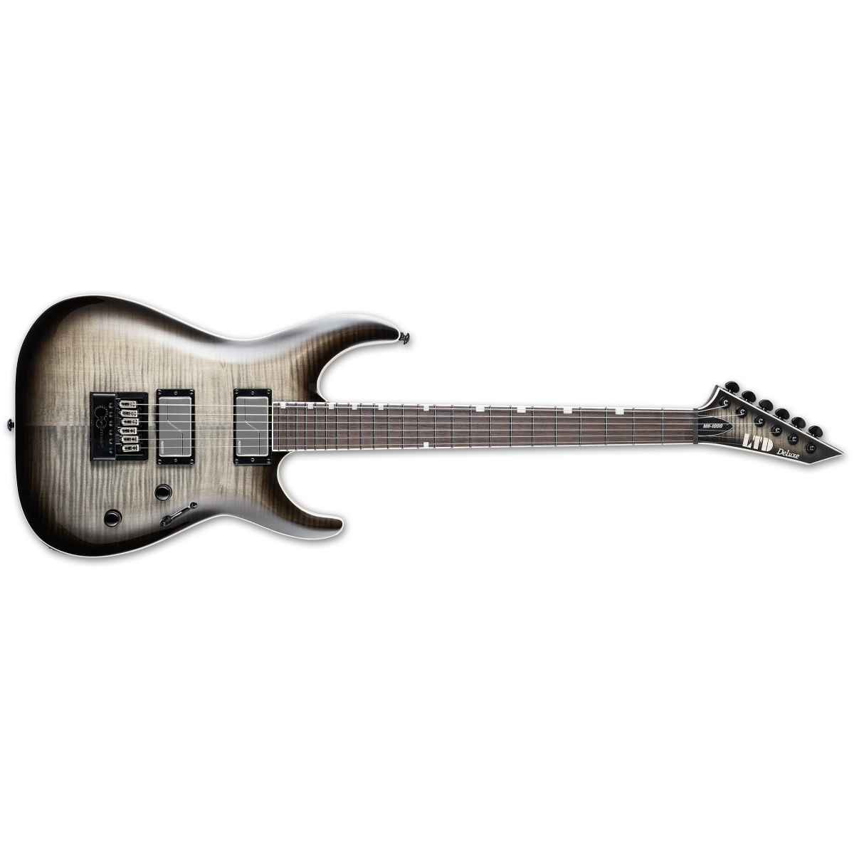 LTD MH serija kombinuje dizajnerske elemente ESP-ovih H/Horizon modela, poput njihovog archtop tijela, kao i karakteristike M/Mirage gitara, poput inline glave i ekstra tankog U-profila vrata. Rezultat je gitara koja besprijekorno funkcioniše u bilo kojem muzičkom stilu. MH-1000 EverTune nudi set-thru konstrukciju sa skalom od 25.5” za jednostavan pristup najvišim pragovima, koristeći tijelo od mahagonija sa topom od plamenastog javora i trodijelni vrat od javora. Ova gitara uključuje inovativni EverTune most sa konstantnom tenzijom, koji osigurava da vaš instrument ostane savršeno naštiman duž cijelog prstohvata u gotovo svim uslovima. Prstohvat od Macassar ebanovine ima kompozitni (compound) radijus za vrhunsku ergonomiju, te sadrži offset bar umetke i 24 extra-jumbo praga od nehrđajućeg čelika. Pored EverTune mosta, MH-1000 dolazi sa atraktivnim setom hardvera u kombinaciji nikla i crne boje, uključujući precizne Grover čivije. Pickupovi na MH-1000 EverTune su inovativni aktivni Fishman Fluence Modern Humbucker pickupovi (keramički na mostu i alnico na vratu), sa push-pull kontrolom za odabir različitih “voice” modova, te brušenim inox poklopcima koji doprinose estetici gitare. Svaki pickup nudi dvije različite zvučne opcije. Kod keramičkog bridge pickupa, Voice 1 predstavlja vrhunski high-output keramički humbucker ton… jasan, agresivan crunch, čvrst bas bez muljavosti i izražen “growl”. Voice 2 pruža moderni pasivni attack sa izuzetno prirodnim karakteristikama distorzije, uz odličnu dinamiku i odziv. Kod alnico neck pickupa, Voice 1 je moderni aktivni high-output ton kompanije Fishman, koji nudi idealan aktivni alnico zvuk: pun, zaobljen i pojačan, ali sa do sada neviđenom artikulacijom i dinamikom. Voice 2 donosi jasan, čist i tečan humbucker ton na vratu kakav ste oduvijek željeli.